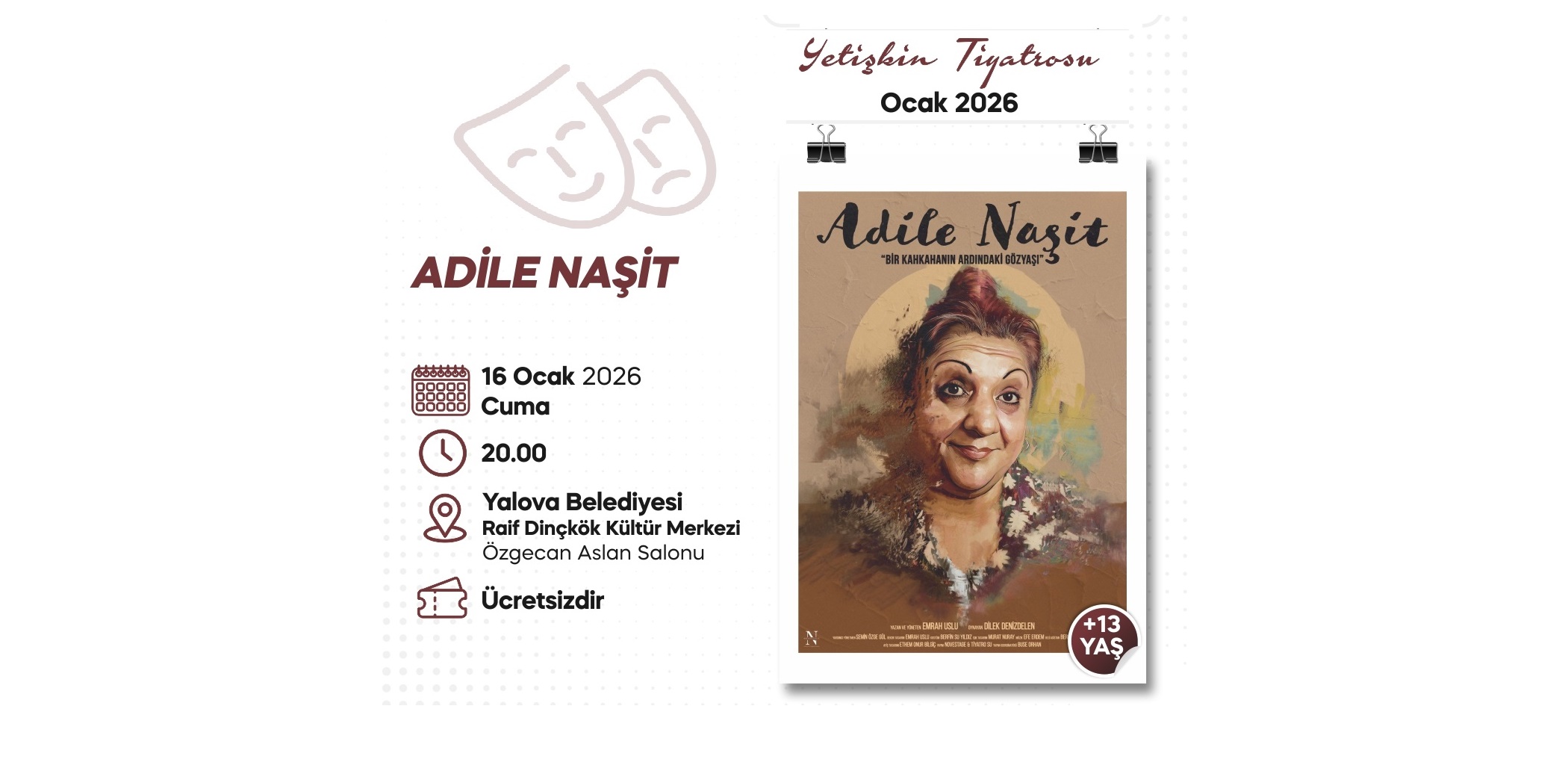 Yalova Belediyesi Kültür, Sanat ve Sosyal İşler Müdürlüğü, yetişkinlere yönelik kültür-sanat etkinlikleri kapsamında tiyatroseverleri art arda iki gün boyunca sahne sanatlarının iki güçlü yapımıyla buluşturuyor. Türk edebiyatının usta ismi Nazım Hikmet Ran ile Türk sinema ve tiyatrosunun unutulmaz yüzü Adile Naşit, Yalova’da tiyatro sahnesinde anılacak.
